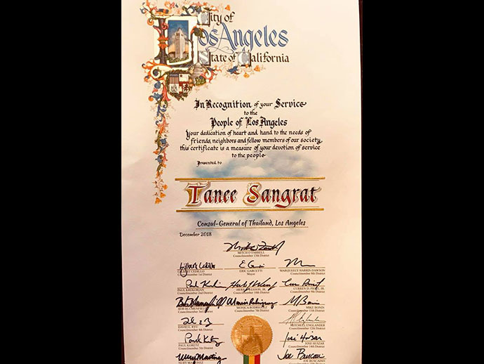 เมื่อวันที่ ๔ ธ.ค. ๒๕๖๑ กงสุลใหญ่ ณ นครลอสแอนเจลิสได้รับเชิญจากสภานครลอสแอนเจลิสให้เข้าร่วมในช่วงการประชุมของสภาฯ และรับใบประกาศเกียรติคุณจากนครลอสแอนเจลิสสำหรับการทำงานบริการชุมชนไทย-อเมริกันในนครลอสแอนเจลิสอย่างแข็งขันตลอดระยะเวลาที่ดำรงตำแหน่ง โดยนาย Mitch O’Farrell, สมาชิกสภานครลอสแอนเจลิส เขต ๑๓ (เขตไทยทาวน์) เป็นผู้แทนนครลอสแอนเจลิสกล่าวชื่นชมการปฏิบัติหน้าที่ของกงสุลใหญ่ฯ และมอบใบประกาศนียบัตรและมีผู้นำชุมชนไทยเข้าร่วมแสดงความยินดีด้วย อาทิ นายกสมาคมไทยแห่งแคลิฟอร์เนียภาคใต้ ประธานคณะกรรมการและนายกสภาไทยทาวน์ และผู้อำนวยการศูนย์ส่งเสริมชาวไทย