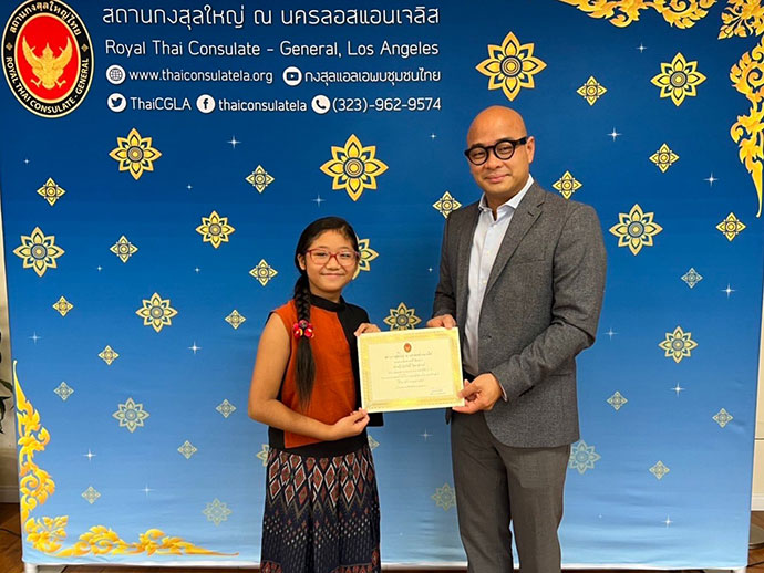 เมื่อวันที่ 3 สิงหาคม 2565 กงสุลใหญ่ฯ ได้มอบเงินรางวัล ประกาศนียบัตร และเข็มที่ระลึก “ยุวทูต” ให้แก่เยาวชนไทยที่ได้รับรางวัลในการประกวดความสามารถด้านภาษาไทยในโครงการ “รู้รักษ์ไทย” ประจำปี 2565 จำนวน 2 คน ได้แก่