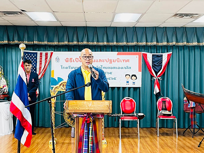 กงสุลใหญ่ฯ ได้กล่าวในพิธีเปิดใจความว่า การเรียนรู้ด้านภาษาถือเป็นทักษะที่สำคัญ การที่เยาวชนไทยที่เกิดและเติบโตในต่างประเทศซึ่งใช้ภาษาอังกฤษส่วนใหญ่ในโรงเรียน ถ้ามีโอกาสมาเรียนภาษาไทยและสามารถอ่านออกเขียนได้ดี จะทำให้เยาวชนมีโอกาสและทางเลือกในการประกอบอาชีพมากขึ้น และขอชื่นชมวัดไทยลอสแอนเจลิส พ่อแม่ผู้ปกครอง และผู้สนับสนุนโรงเรียนฯ ที่เกี่ยวข้องที่ได้สนับสนุนและส่งเสริมให้เยาวชนได้มีโอกาสเรียนรู้ภาษาไทยซึ่งจะทำให้เด็กและเยาวชนไทยมีความผูกพันกับชุมชนไทย อันจะยังประโยชน์ต่อการเสริมสร้างความเข้มแข็งให้ชุมชนไทยต่อไป