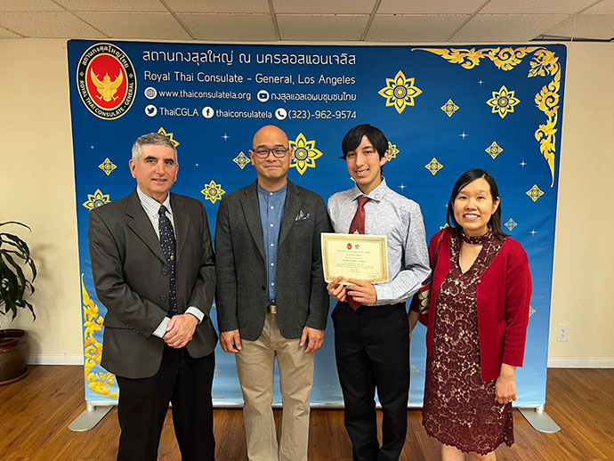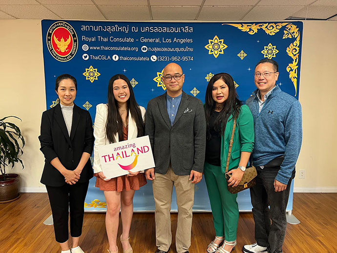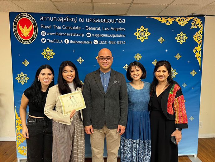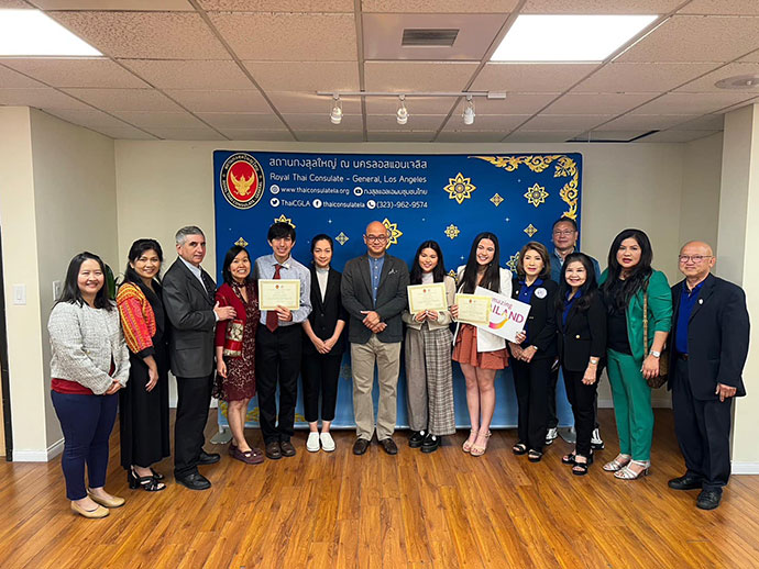 เมื่อวันที่ 10 มิถุนายน 2566 นายต่อ ศรลัมพ์ กงสุลใหญ่ฯ พร้อมด้วยนางมาริสา วงศ์เสรี รองผู้อำนวยการสำนักงานการท่องเที่ยวแห่งประเทศไทย สำนักงานลอสแอนเจลิส และนางนุชนาฎ อุงอำรุง นายกสมาคมไทยแห่งแคลิฟอร์เนียภาคใต้ ได้เข้าร่วมพิธีมอบรางวัล พร้อมประกาศนียบัตรและเข็มที่ระลึก “ยุวทูต” (Young Ambassador) ให้กับผู้ชนะรางวัลในการประกวด Instagram Reel Video Contest หัวข้อ “สานสัมพันธ์สายใยไทย-สหรัฐฯ 190 ปี “Create & Connect: Weaving the Fabric of the Thai-US Partnership” จำนวน 3 รางวัล ได้แก่