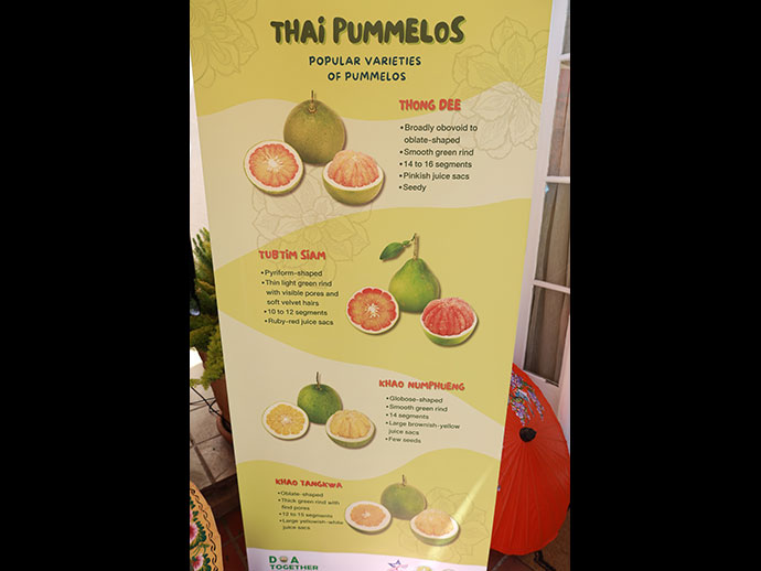 งาน “Afternoon Tea with Thai Pummelos” จัดขึ้นเพื่อประชาสัมพันธ์ศักยภาพของส้มโอไทยในตลาดสหรัฐฯ เน้นกลุ่มเป้าหมายกลุ่มนักธุรกิจผู้นำเข้าสินค้าจากภูมิภาคเอเชีย ร้านอาหารไทย และสื่อมวลชน โดยมีการแนะนำส้มโอสดนำเข้าของไทยทั้ง 5 สายพันธุ์ ได้แก่ ทับทิมสยาม ทองดี ขาวน้ำผึ้ง ขาวใหญ่ ขาวแตงกวา พร้อมทั้งมีการสาธิตการปอกเปลือกส้มโอ และการทำยำส้มโอให้แก่ผู้เข้าร่วมงานได้รับชมและลองรับประทานด้วย ในโอกาสนี้ ผู้อำนวยการสำนักงานส่งเสริมการค้าในต่างประเทศฯ ยังได้ร่วมกิจกรรมจับสลากรายชื่อผู้โชคดีรับบัตรรางวัลรับประทานอาหารมูลค่า 100 ดอลลาร์สหรัฐ ณ ร้านอาหาร Otus Thai Kitchen & Coffee และ Love2Eat ซึ่งเป็นร้านอาหารไทยชื่อดังที่ได้รับตราสัญลักษณ์ Thai SELECT จำนวน 2 รางวัลอีกด้วย