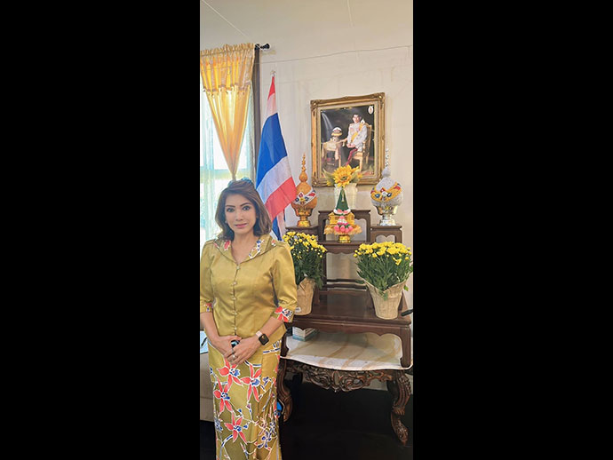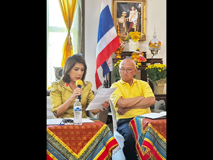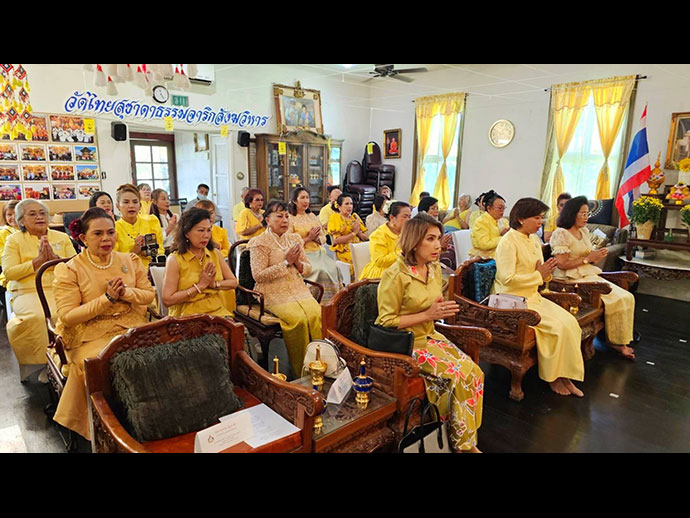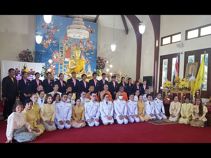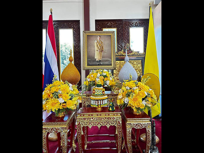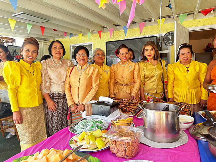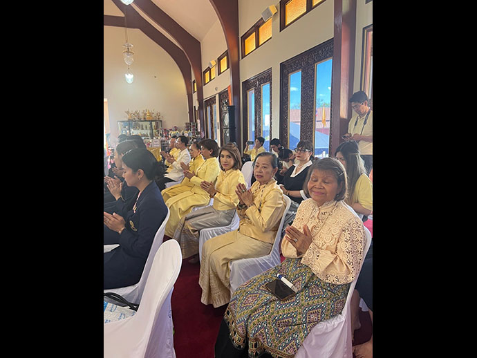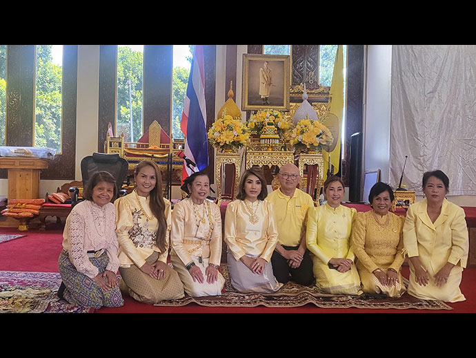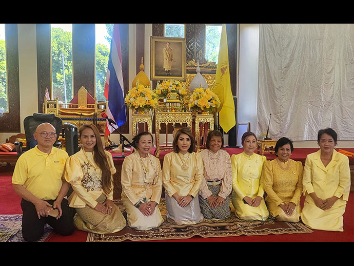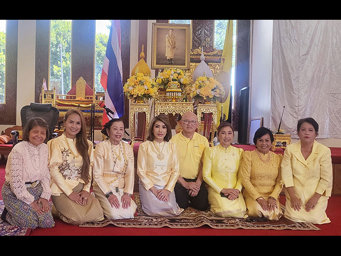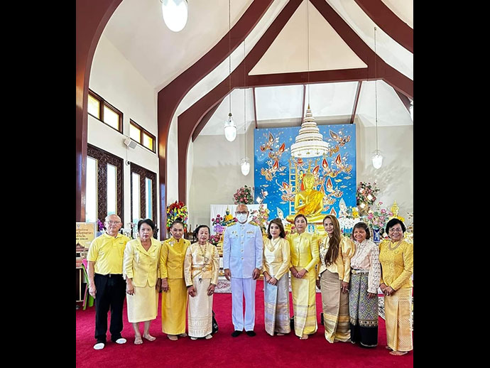 กงสุลใหญ่ นครลอสแองเจลีส ต่อ ศรลัมพ์ ประธานพิธี ถวายพระพร พร้อมคณะ สมาคมไทยแคลิฟอร์เนียภาคใต้ เมื่อวันที่ 28 กรกฎาคม 2023 เนื่องในวันเฉลิมพระชนมพรรษา พระบาทสมเด็จพระเจ้าอยู่หัว รัชกาลที่ 10 ณ .วัดไทย ลอสแองเจลีส ขอพระองค์ ทรงพระเจริญ ยิ่งยืนนาน