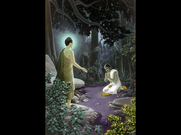 "ที่นี่วุ่ยวายหนอ ที่นี่ขัดข้องหนอ" ท่านเปล่งอุทานกับตัวเองพลางสวมรองเท้าเดินลงจากปราสาท ตรงไปยังประตูใหญ่แล้วเลยออกไปทางป่าอิสิปตนมฤคทายวัน