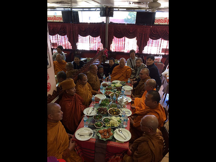 โดยคุณสุพจน์ พนักงานของ ตลาด Lax - C เป็นผู้ประสานงานกับผู้จัดการร้าน สั่งอาหาร เมืองเหนือต้นตำรับ และนิมนต์พระสงฆ์ไปฉันเพล 9 รูป ที่ร้านอาหารชาวเหนือ เลขที่ 5101 Santa Monica Blvd., Los Angeles CA 90029 ญาติโยมติดตามไปเป็นเจ้าภาพใหญ่ ๆ หลายท่าน มีคุณป้าพะเยาว์ ชอบชม, คุณป้าประพิมพ์, คุณสุมาลี (หน่อย) วิวัฒน์พัฒนกุล, คุณจินตนา (หมู)
