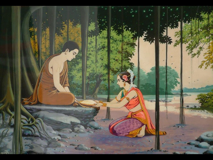 ก่อนที่จะถึงวันวิสาขปุรณมี เพ็ญเดือนหกนางสุชาดาก็ใช้ให้ทาสกรรมกรทั้งหลาย เอาฝูงแม่โคจำนวน 1000 ตัวไปเลี้ยงในป่าชะเอมเครือ เพื่อให้แม่โคทั้งหมดได้บริโภคเครือชะเอม อันจะทำให้น้ำนมมีรสหวานหอม แล้วแบ่งโคนมออกเป็น 2 พวก พวกละ 500 ตัว เพื่อรีดเอาน้ำนมจากแม่โค 500 ตัวในกลุ่มแรกมาให้แม่โคอีก 500 ตัวในกลุ่มหลังบริโภค