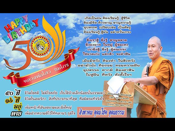 ท้ายที่สุดแห่งสัปดาห์นี้ อาตมาและคณะสงฆ์ พร้อมด้วยพี่น้องชาววัดทุ่งเศรษฐี เมืองเลควูด ขอร่วมอนุโมทนาในกุศลมหากุศล แห่งบารมีมหาบารมี แห่งท่านเจ้าอาวาสวัดบัวหลวงไทย (ท่านหลวงพ่อประเสริฐ อิทฺธิญาโณ) เมือง Tehachapi ที่ท่านเมตตา รักษาผู้เจ็บไข้ที่ไปพบท่านในวันนั้น และท่านได้เมตตามอบ "พระพุทธชินราช" สูง 5 ฟุต ให้กับอาตมา เป็นของขวัญวันเกิดซึ่งอาตมาที่ปลื้มใจที่สุด พร้อมนี้ท่านรับนิมนต์ที่จะเดินทางมาโปรดญาติโยมพี่น้องชาววัดทุ่งเศรษฐี ในเดือนธันวาคมศกนี้ สาธุชนท่านผู้ติดตามคอลัมส์ธรรมะสมสมัยทุกท่าน วันอาทิตย์ที่ 20 สิงหาคม อุดมโชค อุดมธรรม เป็นวันคล้ายวันเกิดของอาตมา และจะเป็นวันประดิษฐาน พระพุทธชินราช" เพื่อเป็นมิ่งขวัญสิริสวัสดิ์พิพัฒน์มงคล จะมีพระสงฆ์ 10 รูป เจริญพุทธมงคลคาถาเสริมบารมี พิธีเริ่ม 10:30 น. เป็นต้นไป ภาคบ่ายก็มีเทศน์มหาชาติธรรมาสน์ทอง จึงขอส่งบุญ ทาน การกุศล ส่งความสุข ความโชคดี มายังทุกท่าน ขอให้สมเหตุปารถนาที่ได้ทำดีไว้ด้วยตลอดกาล ทุกท่านทุกคนคนเทอญ รูปขอจำเริญพร