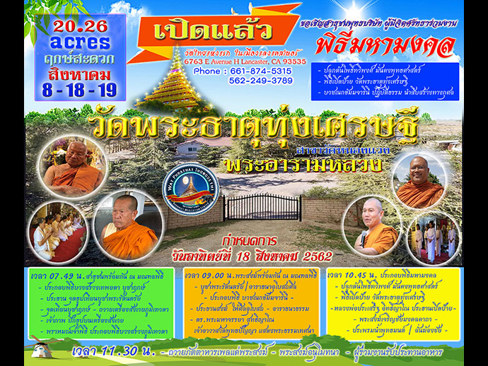 ท่านพุทธบริษัทสาธุชนผู้สนใจในธรรมทั้งหลาย เรื่องแจ้งให้ทราบต่อไป Logo วัดทุ่งเศรษฐี เมืองเลควูด เริ่มจากที่เป็นเอกสารราชการจะเปลี่ยนไปใช้ Logo วัดพระธาตุทุ่งเศรษฐี เมืองแลงแคสเตอร์ แคลิฟอร์เนีย จดหมายสำคัญ ๆ จะได้เริ่มโอน (Transfer) ไปลงที่อยู่วัดใหม่ วัดพระธาตุทุ่งเศรษฐี เลขที่ 6763 East Avenue H, Lancaster, CA 93535 การดำเนินกิจกรรม และโครงการต่าง ๆ จะจดแจ้งลงบนมงคลนาม อันพระเดชพระคุณ "พระธรรมวิสุทธาจารย์" (คูณ ขนฺติโก) เจ้าอาวาสวัดหนองแวง พระอารามหลวง จังหวัดขอนแก่น ที่ท่านได้ประทานให้ พร้อมรับไว้ให้เป็นสาขาวัดหนองแวง พระอารามหลวง และให้อยู่ในการกำกับดูแลของท่านทุกประการ ต่อไปเมื่อก้าวสู่ปลายฤดูฝน ต้นฤดูหนาวของทุก ๆ ปี ก็จะมีเทศกาลไหว้พระธาตุ บนสโลแกนนี้เป็นเบื้องต้น ว่า