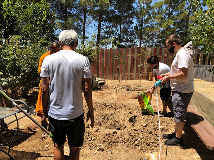 จากสิ่งเล็ก ๆ ที่ตั้งใจ การรุกคืบโครงการปลูกไม้ให้ร่มเรา ในฤดูกาลนี้ปลูกต้นไม้ไปกว่า 50 - 60 ต้นแล้ว ต้นไผ่ตรง / ไผ่สีทอง 14 ต้น ปลูกทิศมงคลตะวันออก กว่า 10 ต้นรอดแล้ว (มั่ง) ทอดยอดใหม่เขียวขจีเป็นทิวแถว ต้นที่ญาติโยมลูกหลานหามาให้อีกนับ 10 ต้น ไม่ทราบว่าชื่ออะไรบ้าง แรก ๆ เขาบอกไว้นานไปก็ลืมแล้ว ชื่อภาษาอังกฤษมันไม่ค่อยเข้าสมองหลวงพ่อเอาซะเลย มี Apricots 2 ต้น มี Cherry 5-6 ต้น มีต้นทับทิม มีต้นหม่อน เกิบ 20 ต้น ต้นไทร 10 ต้น ต้นโพท้องถิ่น 5-6 ต้น โดยกระจายปลูกไปทางด้านหลัง ด้านหลังเราก็ได้เริ่มกันแล้ววันนี้ มีระบบน้ำหยดรอบ บอกได้คำเดียวกันว่า “เราจะสร้างวัดประกาศให้โลกอนุโมทนาบุญใหญ่กับร่มไม้เราธรรมของเราที่มีเป็นปณิธานอย่างเต็มกำลัง" - เราจะร่วมสร้างความฝันและฟันฝ่าอุปสรรคความลำบาก