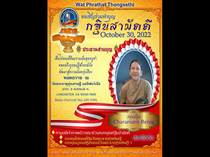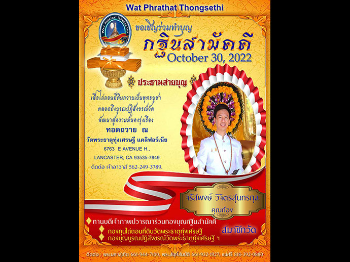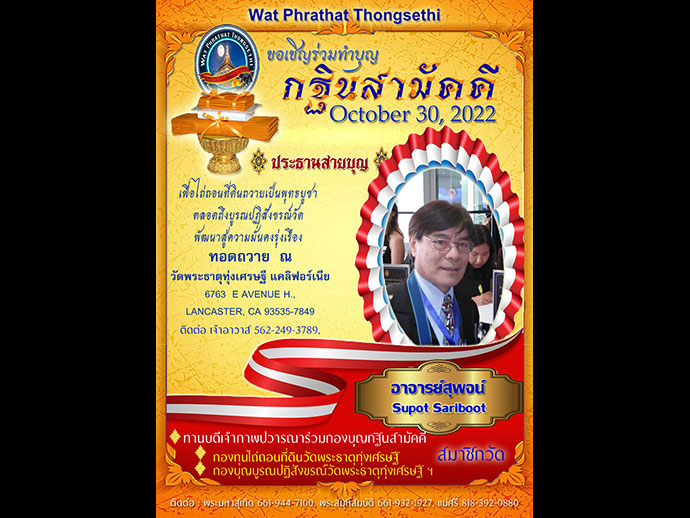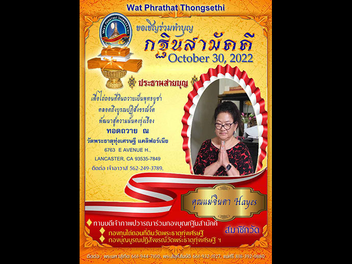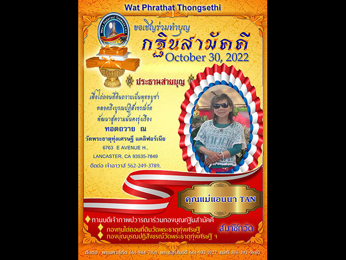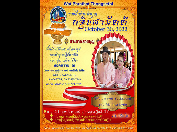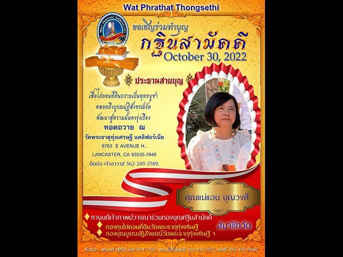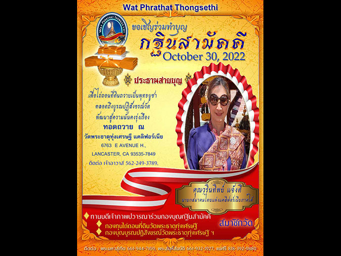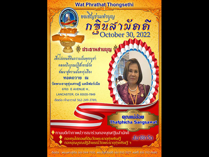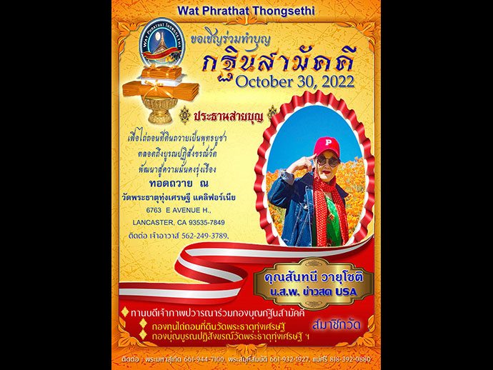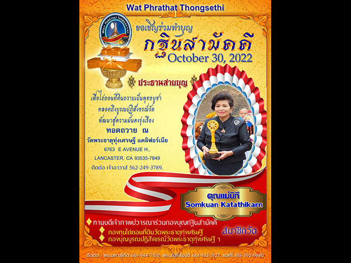 แจ้งขอเชิญร่วมทำบุญกฐินสามัคคี (กฐินรวมใจ) เพื่อไถ่ถอนที่ดินถวายเป็นพุทธบูชา ตลอดถึงบูรณปฏิสังขรณ์วัด พัฒนาสู่ความมั่นคงรุ่งเรือง กำหนดการวันอาทิตย์ที่ 30 ตุลาคม 2565 ทอดถวาย ณ วัดพระธาตุทุ่งเศรษฐี แคลิฟอร์เนีย 6763 E AVENUE H., LANCASTER, CA 93535-7849