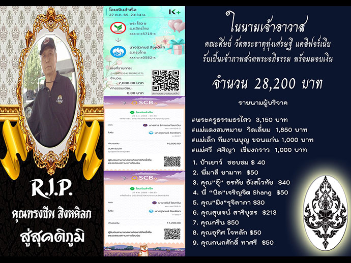 ดังนั้นใจนามเจ้าอาวาส และคณะศิษย์วัดพระธาตุทุ่งเศรษฐีเราได้รวบรวมปัจจัยโอนไปให้คุณป้าสุวคนธ์ สิงหดิลก (ภรรยา) ที่จังหวัดสุรินทร์ เป็นจำนวนเงิน 28,200 บาทถ้วน