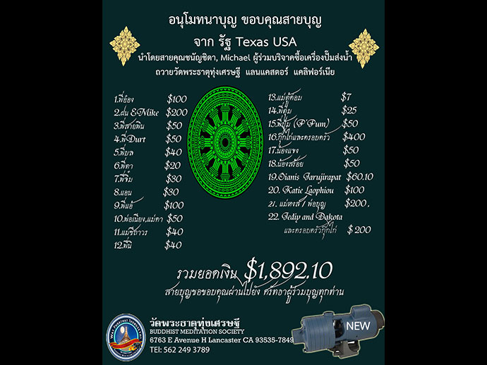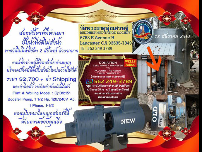 ขอน้ำใจท่านผู้มีจิตศรัทธา สองสัปดาห์ที่ผ่านมา ปั้มน้ำที่วัดไม่ส่งน้ำ ทางวัดไม่มีน้ำใช้มา 2 สัปดาห์ ลำบากมาก (ทางวัดทุ่งเศรษฐี ยังอยู่ในเขตที่ใช้น้ำบ่อบาดาล) ขอน้ำใจท่านผู้มีจิตศรัทธาร่วมบุญ บริจาคปัจจัยซื้อปั้มส่งน้ำใหม่ถวายให้วัด ราคา $2,700 + ค่า Shipping และค่าติดตั้ง พร้อมค่าประกันสินค้า Flint & Walling Model : Cj101b151 Booster Pump, 1 1/2 Hp, 120/240V Ac, 1 Phase, 1-1/2