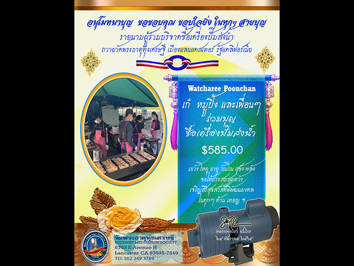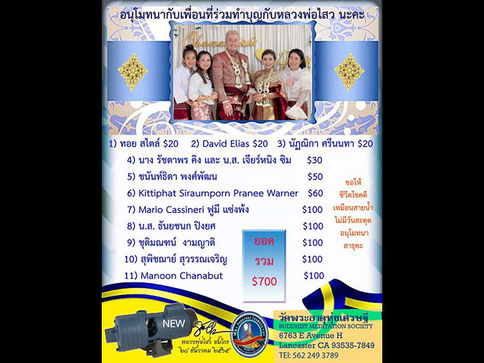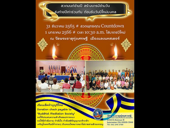 อีกประการหนึ่ง ขอเจริญพรท่านผู้มีใจเป็นกุศลที่จะเดินทางไปร่วม สวดมนต์ข้ามปี สร้างบารมีข้ามวัน ส่งท้ายปีเก่าร่วมกัน ต้อนรับวันปีใหม่มงคล และสามารถส่งเช็คร่วมทำบุญปีใหม่ได้ที่ 6763 E AVENUE H., LANCASTER, CA 93535-7849 Donation check payable to "Buddhist Meditation Society" สอบถามเพิ่มเติมได้ที่ โทร : 562 249 3789 รูปขอจำเริญพร