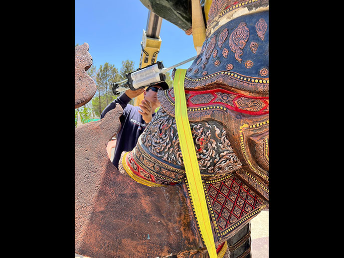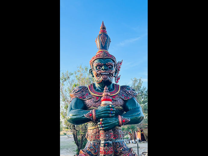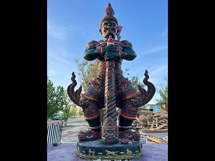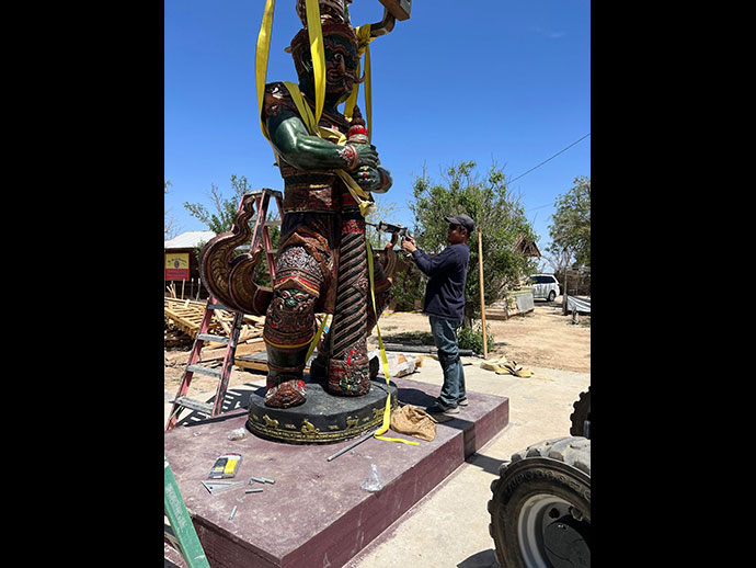 ประการที่ 2 ตอนแรกตั้งใจว่าอย่างน้อยต้องสร้างให้ได้ 3 เมตร และก็ประกาศออกไปเป็นอย่างนั้น แต่เหนือความคาดหมายอีกครั้งคือ คุณก้องตัดสินใจที่จะสร้างทั้งทีต้องเอาองค์ใหญ่ แม้ว่าเบื้องต้นจะดูว่ายากลำบาก ทั้งน้ำหนักองค์ท้าวเวสสุวรรณองค์นี้ก็มาก ทราบว่าหนักถึง 2 ตัน จึงจำเป็นต้องแบ่งส่วนเป็น 2 ตอน (ดังที่เห็นตามภาพนั้น) ทำให้การขนย้ายทั้งภายในประเทศไทย และประเทศอเมริกา ต้องใช้สรรพกำลังเครื่องมือเครื่องยนต์กลไกอย่างพิเศษทุกขั้นตอน