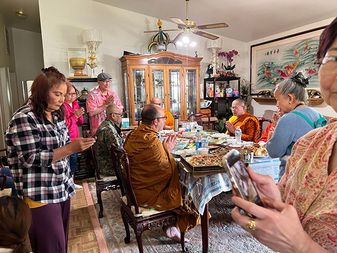 ทางร้านเดอะภูเขา โดยคุณใหญ่ Aksarapak ได้เอาใจใส่กิจกรรมกิจการใส่บาตรอย่างแข็งขัน ฝ่าฟันอุปสรรคนานา ทั้งโควิด โคขวิด จนเป็นที่น่าชื่นชมความเข้มแข็ง คำพูดที่เราได้ยินกันอย่างปลื้มปริ่มอยู่บ่อยคือ ขอเชิญนะคะ มาช่วยกันธำรงพระพุทธศาสนาร่วมกันนะคะ มีใส่บาตรพระสงฆ์ทุกเช้าวันเสาร์ 7.โมงเช้า ถึง 9 โมงเช้า 9 โมงกว่าๆ คะ ท่านทั้งหลาย ในนครลอสแองเจลิสก็มีไม่กี่แห่งนะที่มีกิจกรรมการตัดใส่บาตร ข้าวปลาอาหารที่ท่านใส่บาตรถวายพระสงฆ์ นับว่าเป็นประโยชน์มากๆ ที่เดียว อาตมานี้อยู่ไกลเมือง ได้อาหารบิณฑบาตรจากวันเสาร์ พามาไว้ในตู้เย็นฉันได้เป็นอาทิตย์ๆ