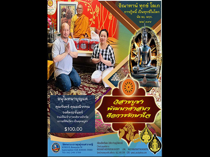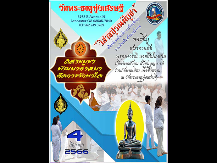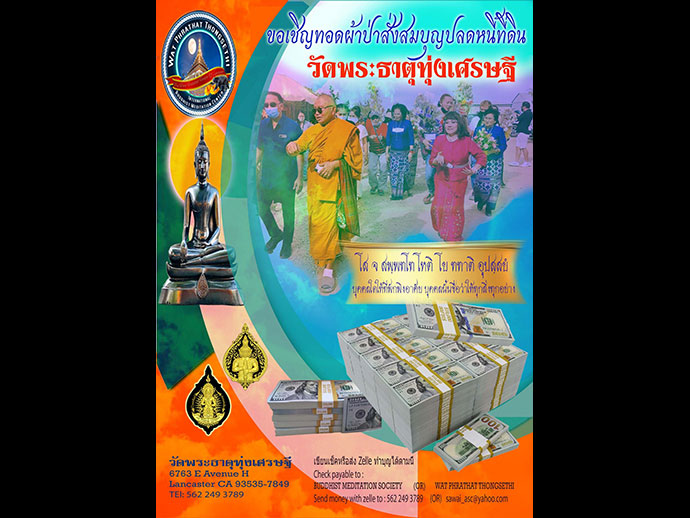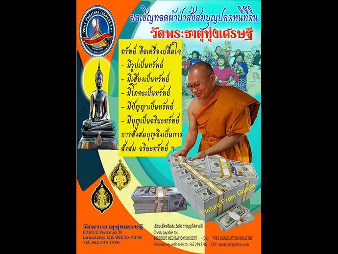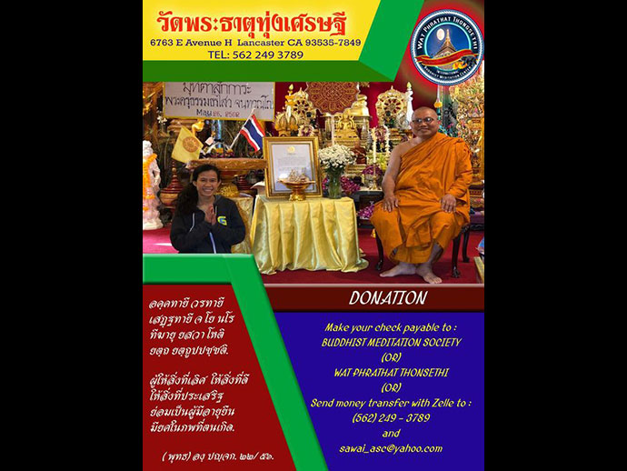ติดต่อสอบถาม วัดพระธาตุทุ่งเศรษฐี 6763 E Avenue H Lancaster CA 93535 Tel: 562-249-3789 ขอขอบคุณคุณโยมนิคม คุณโยมพรทิพย์รัตน์ เหมานนท์ ฝากเช็คบำรุงวัด $100.00 คุณโยมรพีพรรณ สมวงศ์ $20.00 คุณจันทร์ คุณมณีวรรณ วงศ์พระจันทร์ $100.00 ขออำนาจคุณพระศรีรัตนตรัย บารมีหลวงพ่อเพชรมีชัย พระประธานวัดพระธาตุทุ่งเศรษฐี บารมีท่านท้าวเวสสุวรรณ บัลดลให้ท่านปลอดภัยโชคดี ลาภผลพูนทวี ชีวิตดี การงานมั่นคง สำเร็จทุกสิ่งสมประสงค์ สมเจตน์จำนง แห่งผู้ปฏิบัติบำเพ็ญจงทุกประการด้วย เทอญ ฯ รูปขอจำเริญพร
