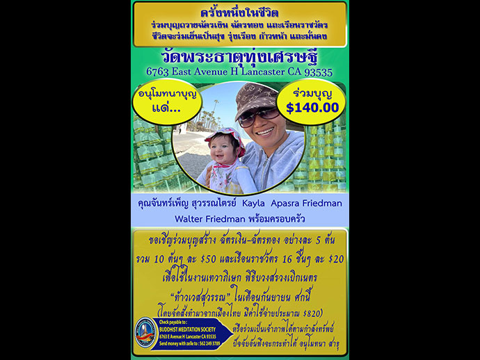 ตอนนี้ได้คุยกับทางช่างที่เขาออกมาซ่อมให้ เขาบอกกับทางเราว่าสามารถ Hold on ถือเช็คไว้ได้ 5 Business Day เบื้องต้นตอนนี้โทรไปหาหยิบยืมใครได้ก็แก้ปัญหาเพฉาะหน้าไปก่อน สำหรับท่านผู้มีจิตศรัทธาที่ต้องการช่วยแบ่งเบาภาระรับเป็นเจ้าภาพส่วนนี้ (ซึ่งอาตมาก็ไม่แน่ใจว่าเขาเรียกอุการณ์นี้ว่าอะไร ได้ยินเขาเรียกตอนโทรเช็ค Order ว่า Outdoor Tank water heater propane) กรุณาติดต่อสอบถาม วัดพระธาตุทุ่งเศรษฐี 6763 E Avenue H Lancaster CA 93535 Tel: (562) 249-3789