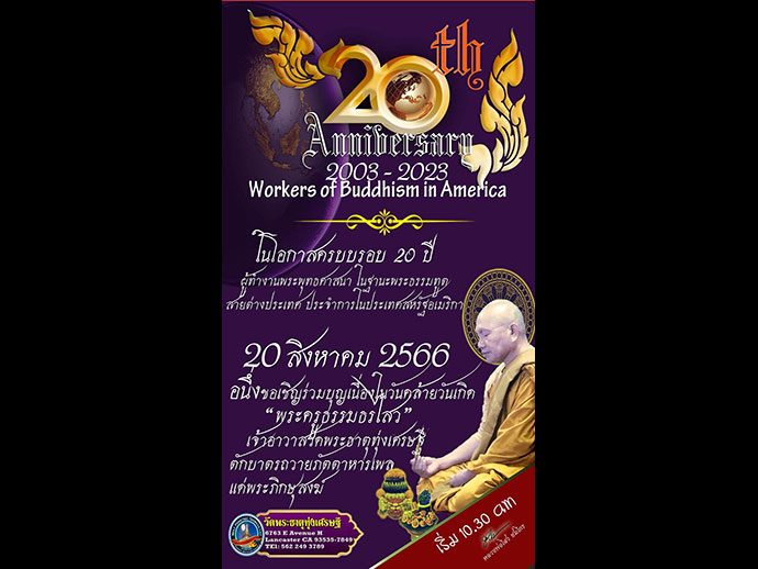 ขอความสวัสดีจงปรากฏแด่ท่านผู้เจริญทุกคนทุกท่าน 20 ปี ผ่านไปแบบเรียบง่าย หลวงพ่อไสวมีชีวิตที่อาศัยศรัทธาพุทธศาสนิกชนในอเมริกา ภิกษุผู้อยู่ง่ายเลี้ยงง่ายเสียสละสะสางไม่สะสม วันเวลาผ่านไปเหมือนว่าไม่นาน แต่ที่ไหนได้ผ่านไปได้ 20 ปีแล้ว ดีใจนะที่ได้มาสร้างบารมีที่อเมริกา วันอาทิตย์ ที่ 20 สิงหาคม ศกนี้ ขอเชิญชวนท่านผู้ที่เคารพนับถือ ตลอดถึงศิษยานุศิษย์วัดพระธาตุทุ่งเศรษฐี แลงแคสเตอร์ แคลิฟอร์เนีย ร่วมบุญฉลอง 20 ปี เจ้าอาวาสปฏิบัติศาสนกิจ ในนามธรรมทูตสายต่างประเทศประจำการในอเมริกา