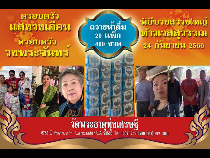 ตามที่ได้แจ้งกำหนดการพิธีบวงสรวงองค์ท้าวเวสสุวรรณไปแล้วนั้น ในวันอาทิตย์ที่ 24 กันยายน ศกนี้ ขอจำเริญพรชวนเชิญศิษยานุศิษย์ตลอดถึงสาธุชนผู้มีศรัทธาให้ได้มาร่วมบุญพิธีโดยทั่วกัน ฯ วันงานท่านกงสุลใหญ่แห่งมหานคร ลอสแองเจลลิส พร้อมคณะเดินทางมาเป็นประธารในพิธี โดยทางวัดพระธาตุทุ่งเศรษฐี ร่วมกับชมรมอนุรักษ์ศาสนพิธีไทยในสหรัฐอเมริกา คุณก้อง จรัสพงษ์ วิจิตรสุนทรกุล (พราหมณ์บัณฑิต) กำหนดจัดงานพิธีบวงสรวงองค์ท้าวเวสสุวรรณ ประจำปี 2566 ขึ้นใน วันอาทิตย์ ที่ 24 กันยายน พ.ศ. 2566 เริ่มต้น 10 โมงเช้าเป็นต้นไป สอบถามรายละเอียดเพิ่มเติมได้ที่ (562) 249 3789 (310) 988 5845 (818) 392 0880