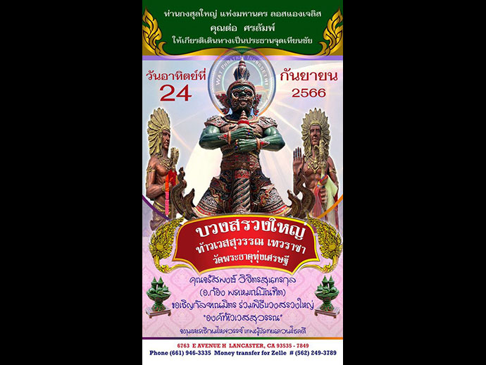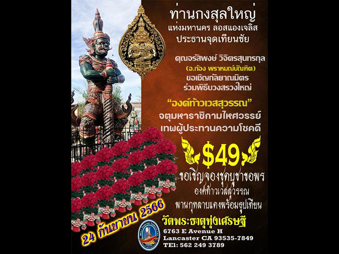 ตามที่ได้แจ้งกำหนดการพิธีบวงสรวงองค์ท้าวเวสสุวรรณไปแล้วนั้น ในวันอาทิตย์ที่ 24 กันยายน ศกนี้ ขอจำเริญพรชวนเชิญศิษยานุศิษย์ตลอดถึงสาธุชนผู้มีศรัทธาให้ได้มาร่วมบุญพิธีโดยทั่วกัน ฯ วันงานท่านกงสุลใหญ่แห่งมหานคร ลอสแองเจลลิส พร้อมคณะเดินทางมาเป็นประธารในพิธี โดยทางวัดพระธาตุทุ่งเศรษฐี ร่วมกับชมรมอนุรักษ์ศาสนพิธีไทยในสหรัฐอเมริกา คุณก้อง จรัสพงษ์ วิจิตรสุนทรกุล (พราหมณ์บัณฑิต) กำหนดจัดงานพิธีบวงสรวงองค์ท้าวเวสสุวรรณ ประจำปี 2566 ขึ้นใน วันอาทิตย์ ที่ 24 กันยายน พ.ศ. 2566 เริ่มต้น 10 โมงเช้าเป็นต้นไป สอบถามรายละเอียดเพิ่มเติมได้ที่ (562) 249 3789 (310) 988 5845 (818) 392 0880 รูปขอจำเริญพร