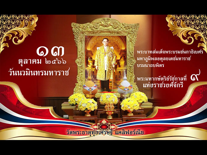 13 ตุลาคม วันนวมินทรมหาราช พระบาทสมเด็จพระบรมชนกาธิเบศร มหาภูมิพลอดุลยเดชมหาราช บรมนาถบพิตร ในนามศิษยานุศิษย์ชาววัดพระธาตุทุ่งเศรษฐี แคลิฟอร์เนีย ขอน้อมรำลึกในพระมหากรุณาธิคุณอันหาที่สุดมิได้