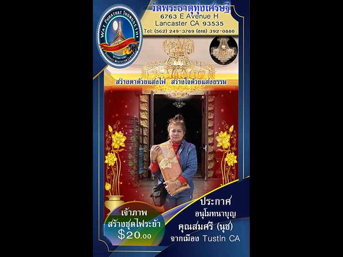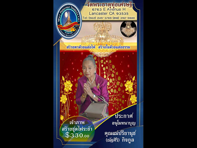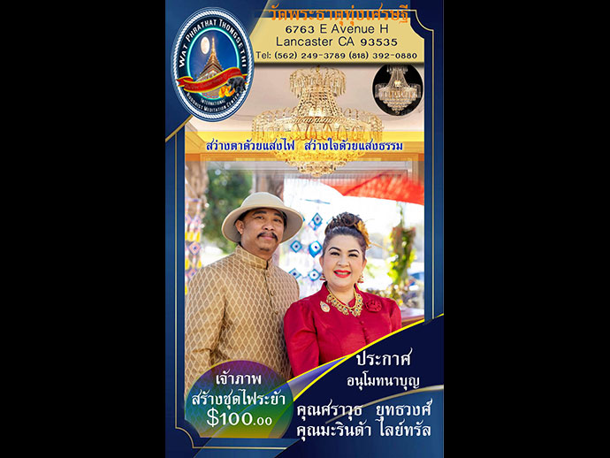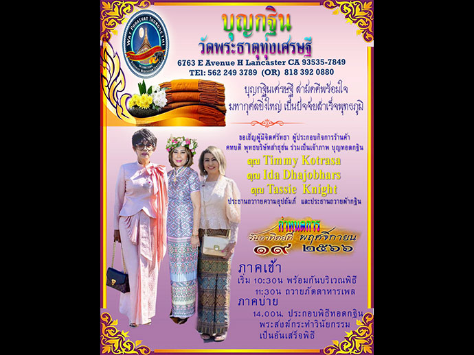อีกราวๆ 2 สัปดาห์ก็จะถึงวันออกพรรษาจะครบ 3 เดือนไตรมาสแล้ว ชั่วประเดี๋ยวฤดูกาลก็จำผ่านเลยไป ทิวาราตรีของบัณฑิตท่านกล่าวไว้ว่า ผ่านไปอย่างรวดเร็ว ออกพรรษานี้ขอเชิญพี่น้องผองเพื่อน เดินทางไปร่วมบุญใหญ่ที่วัดพระธาตุทุ่งเศรษฐี ตามวันเวลานี้เลย ขอเชิญผู้มีจิตศรัทธาทุกท่าน ร่วมเป็นเจ้าภาพทอดกฐินสามัคคี วัดพระธาตุทุ่งเศรษฐี เมืองแลงแคสเตอร์ 6763 E AVENUE H LANCASTER CA 93535 (562) 249-3789 and (818) 392-0880