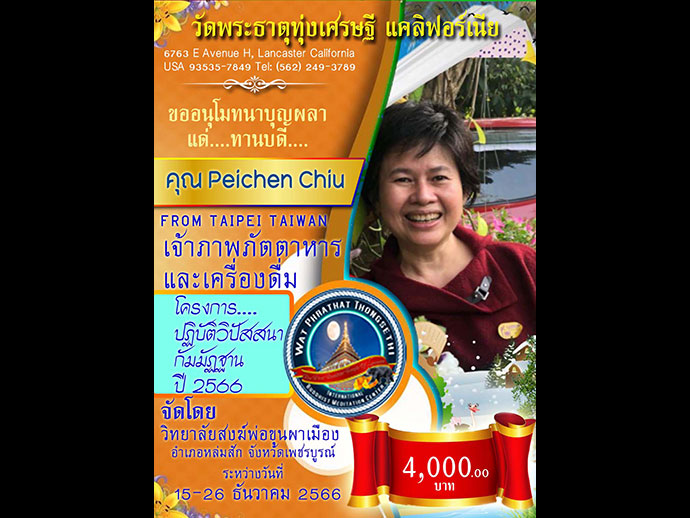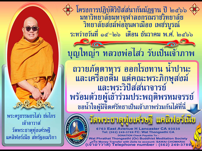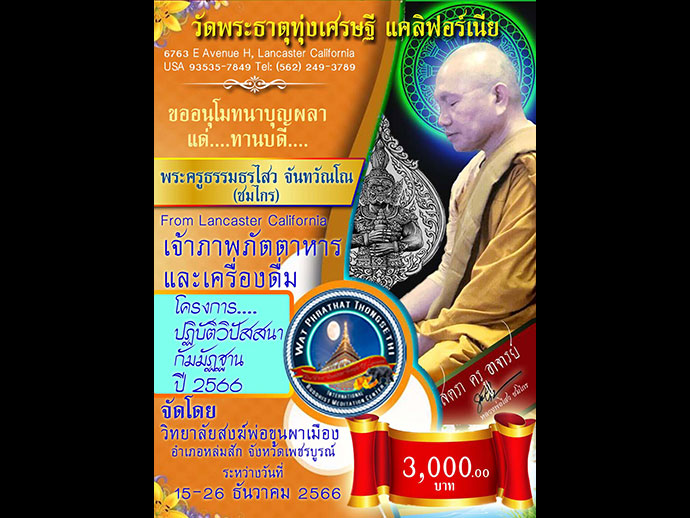 หลวงพ่อพระครูธรรมธรไสว จะมีการจัดปฏิบัติธรรม เพื่อน้อมรำลึกพระมหากรุณาธิคุณฯ วันพ่อแห่งชาติ ประจำปี 2566 ณ วัดพระธาตุทุ่งเศรษฐี 6763 E Avenue H Lancaster CA 93535 โทร. (818) 392 - 0880 (562) 249 - 3789 Line ID: bmsn2008 ขอเชิญร่วมสั่งสมคุณความดี สร้างบารมีรักษาศาสนธรรมโดยพร้อมเพรียงกัน ระหว่างวันที่ 15 - 26 ธันวาคม ศกนี้ ขอความเจริญงอกงามไพบูลย์จงปรากฏแก่ศรัทธาทุกท่าน รูปขอจำเริญพร
