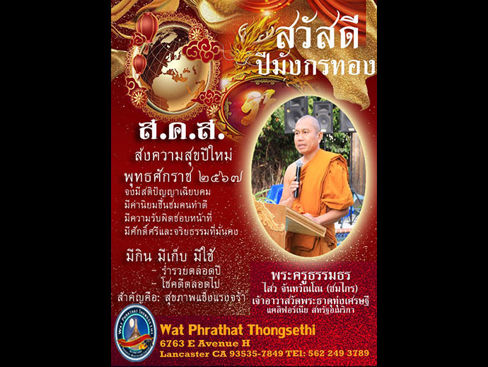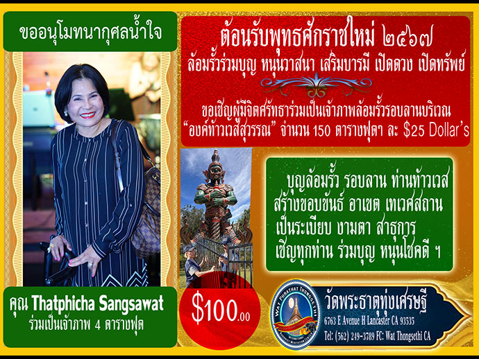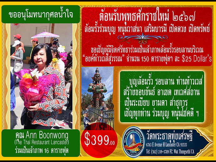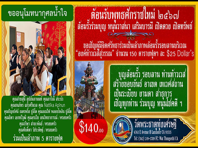 Donation check payable to : WAT PHRATHAT THONGSETHI 6763 East Avenue H, Lancaster, CA 93535-7849 Zelle money transfer to Telephone number : 562 249 3789 Account : SAWAI CHOMKRAI Wells Fargo Bank