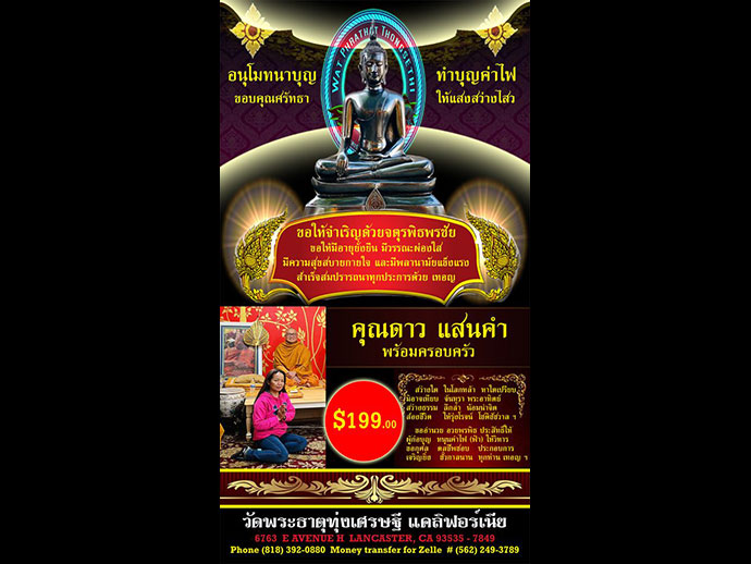 ขออานิสงส์แห่งบุญผลา จงรักษาท่านให้เจริญในที่ทุกสถาน ตลอดกาลทุกเมื่อด้วย เทอญ สอบถามเพิ่มเติมได้ที่ วัดพระธาตุทุ่งเศรษฐี โทร. (818) 392 - 0880 (562) 249 - 3789 Line ID: bmsn2008 ขอเชิญร่วมทำบุญสร้างรั้วรอบบริเวณลานพื้นที่องค์ท้าวเวสสุวรรณ ขอความเจริญงอกงามไพบูลย์จงปรากฏแก่ศรัทธาทุกท่าน รูปขอจำเริญพร