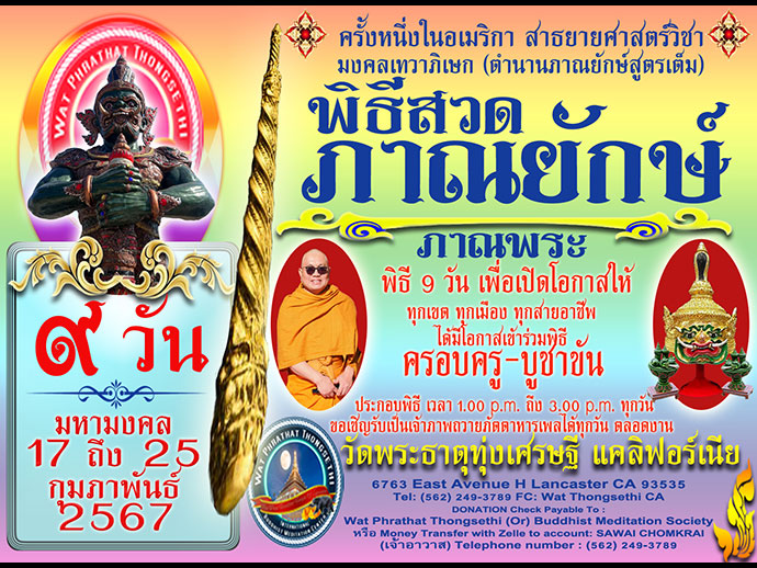 ซึ่งนับได้ว่าจะเป็นครั้งแรกของทางวัด และจะเป็นครั้งแรกในอเมรกาในการจัดให้มี พิธีสวดภาณยักษ์ (สูตรเต็ม) โดยกำหนดจัดขึ้นในวันที่ 17 - 25 กุมภาพันธ์ ศกนี้ เป็นเวลา 9 วัน ทั้งนี้