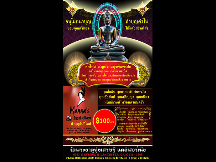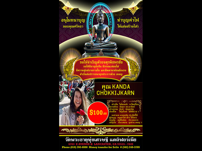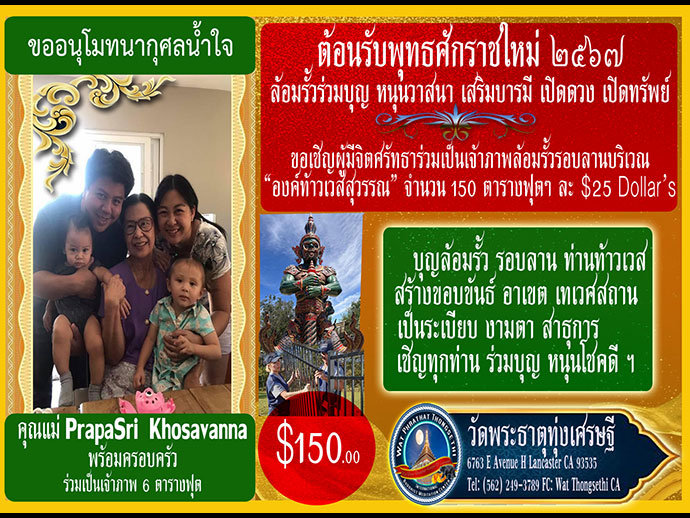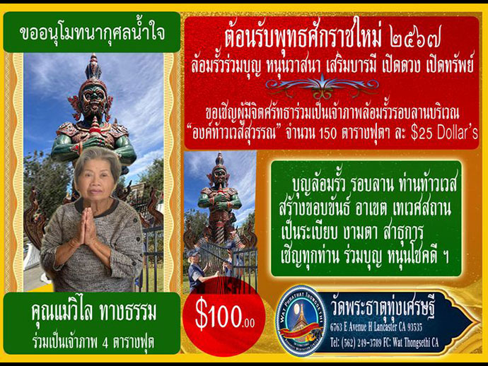 ขออานิสงส์แห่งบุญผลา จงรักษาท่านให้เจริญในที่ทุกสถาน ตลอดกาลทุกเมื่อด้วย เทอญ สอบถามเพิ่มเติมได้ที่ วัดพระธาตุทุ่งเศรษฐี โทร. (818) 392 - 0880 (562) 249 - 3789 Line ID: bmsn2008 ขอเชิญเข้าร่วมพิธีสวดภาณยักษ์ ณ ลานองค์ท้าวเวสสุวรรณ วัดพระธาตุทุ่งเศรษฐี แคลิฟอร์เนีย เลขที่ 6763 East Avenue H, Lancaster, CA 93535 ขอความเจริญงอกงามไพบูลย์จงปรากฏแก่ศรัทธาทุกท่าน รูปขอจำเริญพร
