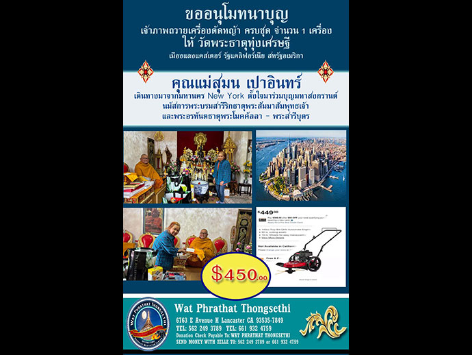 จำเริญพร ขอชวนเชิญสาธุชนศรัทธาทุกท่าน ร่วมเป็นเจ้าภาพผ้าป่าสามัคคี 999 กอง "สะสมบุญสร้างบารมี ปลดหนี้ที่ดินวัด" กองบุญละ $20 ดอลลาร์ ทอดถวาย ณ วัดพระธาตุทุ่งเศรษฐี 6763 East Avenue H. Lancaster CA 93535 Tel: (562) 249-3789 วันอาทิตย์ที่ 7 เมษายน พุทธศักราช 2567