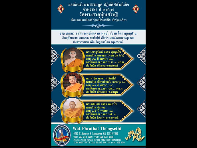 สำหรับท่านผู้มีจิตศรัทธาร่วมสนับสนุนบำรุ่งวัดพัฒนาด้านต่างๆ เช่น ช่วยค่าน้ำ ค่าไฟ ร่วมถวายวิหารทาน เป็นต้นฯ และในวันที่ 15 พฤษภาคม ศกนี้ ทางวัดได้อาราธนานิมนต์พระธรรมทูตสายต่างประเทศ ผ่านการอบรม คืออบรมผ่านหลักสูตร เป็นพระธรรมทูตสายต่างประเทศ รุ่น 26 เพื่อมาประจำอยู่จำพรรษาครบคณะสงฆ์ 3 รูป รวมพระสงฆ์จำพรรษานี้จำนวน 4 รูป ท่านใดมีใจเลื่อมใสศรัทธาร่วมถวายค่าตั๋วเดินทางพระธรรมทูตที่มาปฏิบัติศาสนกิจพรรษานี้ กรุณา Donation check payable to "Buddhist Meditation Society" หรือ อีกบัญชีหนึ่งชื่อ Wat Phrathat Thongsethi ส่งไปตามที่อยู่ที่แจ้งไว้พร้อมนี้ 6763 East Avenue H. Lancaster CA 93535 ส่วนท่านที่สะดวก Transfer money with Zelle ก็โอนด้วยเบอร์ Tel: (562) 249-3789