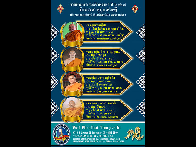 สำหรับท่านผู้มีจิตศรัทธาร่วมสนับสนุนบำรุ่งวัดพัฒนาด้านต่างๆ เช่น ช่วยค่าน้ำ ค่าไฟ ร่วมถวายวิหารทาน เป็นต้นฯ และในวันที่ 15 พฤษภาคม ที่ผ่านมา พระธรรมทูตสายต่างประเทศ รุ่น 26 ได้เดินทางมาถึงแล้ว เพื่อมาประจำอยู่จำพรรษาครบคณะสงฆ์ 3 รูป รวมพระสงฆ์จำพรรษานี้จำนวน 4 รูป ท่านใดมีใจเลื่อมใสศรัทธาร่วมถวายค่าตั๋วเดินทางพระธรรมทูตที่มาปฏิบัติศาสนกิจพรรษานี้ กรุณา Donation check payable to "Buddhist Meditation Society" หรือ อีกบัญชีหนึ่งชื่อ Wat Phrathat Thongsethi ส่งไปตามที่อยู่ที่แจ้งไว้พร้อมนี้ 6763 East Avenue H. Lancaster CA 93535 ส่วนท่านที่สะดวก Transfer money with Zelle ก็โอนด้วยเบอร์ Tel: (562) 249-3789
