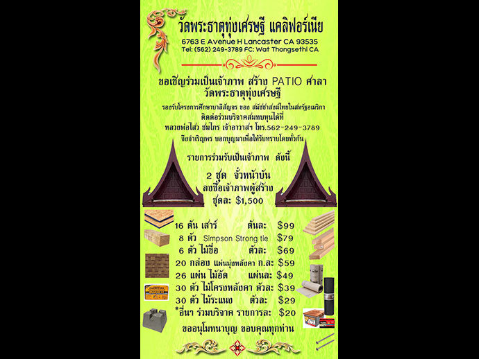 สำหรับท่านผู้มีจิตศรัทธาร่วมสนับสนุนบำรุ่งวัดพัฒนาด้านต่างๆ เช่น ช่วยค่าน้ำ ค่าไฟ ร่วมถวายวิหารทาน (ตอนนี้กำลังทำ PATIO ศาลาอเนกประสงค์อยู่นะมีกำลังก็ช่วยกันสมทบทุนจ้า) และอีกประการหนึ่งในวันที่ 7 มิถุนายน 2567 หลวงพ่อไสวจะพาพระธรรมทูตสายต่างประเทศ ที่ได้มาประจำอยู่จำพรรษากับทางวัดพระธาตุทุ่งเศรษฐี 3 รูป ไปร่วมงานประชุมสมัชชาสงฆ์ไทยในสหรัฐอเมริกา ที่วัดไทยกรุงวอชิงตัน DC ท่านใดมีใจเลื่อมใสศรัทธาร่วมถวายค่าตั๋วเดินทางพระธรรมทูตที่มาปฏิบัติศาสนกิจพรรษานี้ กรุณา Donation check payable to "Buddhist Meditation Society" หรือ อีกบัญชีหนึ่งชื่อ Wat Phrathat Thongsethi ส่งไปตามที่อยู่ที่แจ้งไว้พร้อมนี้ 6763 East Avenue H. Lancaster CA 93535 ส่วนท่านที่สะดวก Transfer money with Zelle ก็โอนด้วยเบอร์ Tel: (562) 249-3789