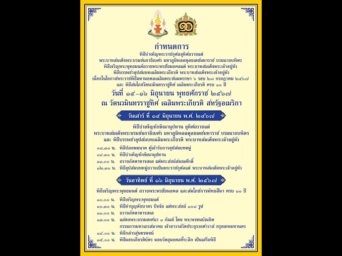 ส่วนสัปดาห์นี้นั้น ได้เดินทางไปร่วมงาน เฉลิมพระเกียรติ ที่วัดนวมินทรราชูทิศ ปัจจุบัน 382 South Street East เมืองเรย์แฮม รัฐแมสซาชูเซตส์ 02767 เมื่อวันที่ 2 กรกฎาคม พ.ศ. 2547 และได้มีพิธีเปิดโครงการก่อสร้างอุโบสถหรือ Ground Breaking เมื่อเวลา 10.09 น.ของวันที่ 20 กันยายน พ.ศ. 2547 โดยระบุว่าพระอุโบสถทรงไทยประยุกต์ ที่มีพื้นที่ 110,000 ตารางฟุต ใช้งบก่อสร้าง 50 ล้านดอลลาร์สหรัฐ ซึ่งจะทำให้วัดแห่งนี้กลายเป็นวัดไทยนอกประเทศที่ใหญ่ที่สุด