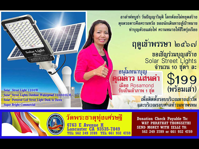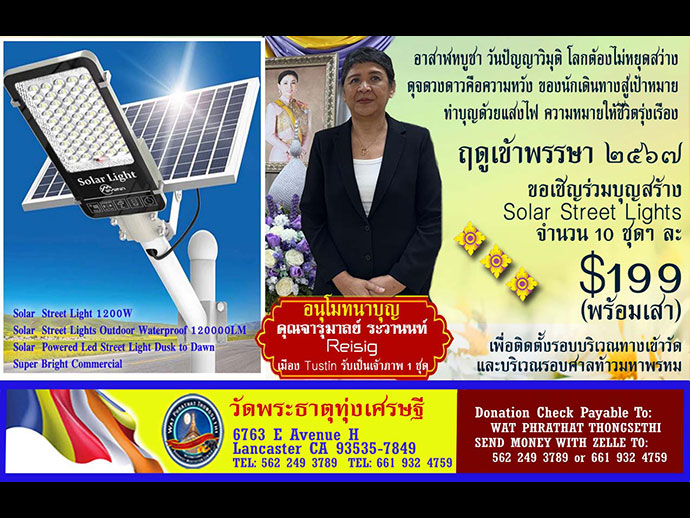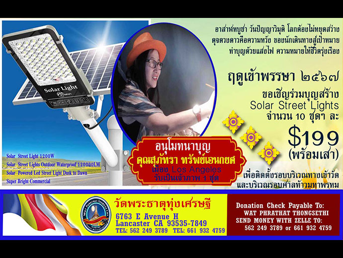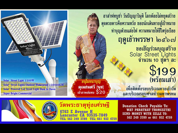 ในกาลนี้ทางวัดพระธาตุทุ่งเศรษฐี ได้บูรณาการพิธีถวายเทียนพรรษามาเป็นการถวาย Solar Street Lights จำนวน 10 ชุดๆ $199.00 (พร้อมเสา แทนการถวายเทียน) หรือถ้ามีเจ้าภาพไม่ครบก็สามารถจัดไว้ในโครงการตลอดพรรษาได้ หรือ อาจถ้ามีเจ้าภาพจองมากกว่าก็จะพิจารณาจัดประโยชน์อื่นๆ ได้ สำคัญต้องมีต้นทุนนั่นเอง ฯ