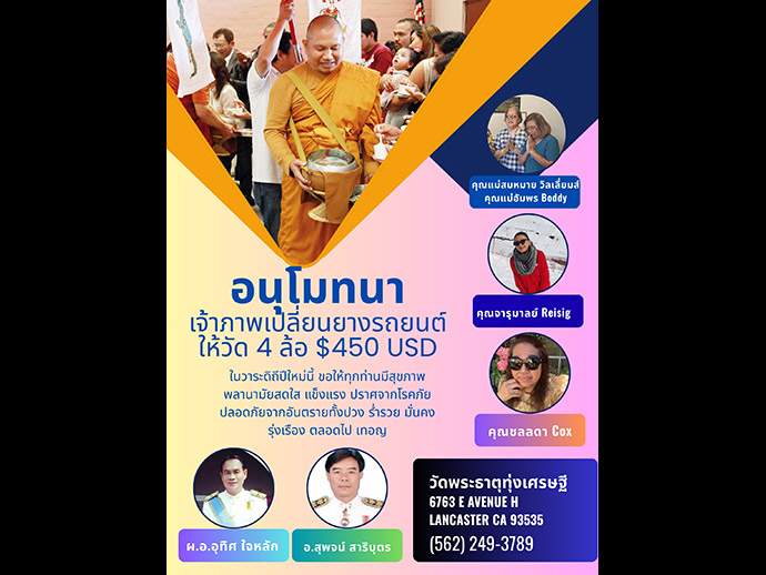 ขอเชิญร่วมสนับสนุนบริจาคปัจจัยสมทบทุนทอดผ้าป่าสามัคคีต้อนรับปีใหม่ เพื่อบำรุ่งส่งเสริมเติมค่าน้ำ ค่าแก๊ส ค่าไฟฟ้า และเพื่อพัฒนาเสนาสนะที่อยู่อาศัยของวัดได้โดย Donation check payable to "Buddhist Meditation Society" หรือ Wat Phrathat Thongsethi ส่งไปตามที่อยู่ที่แจ้งไว้นี้ 6763 East Avenue H. Lancaster CA 93535 ส่วนท่านที่สะดวก Transfer money with Zelle ก็โอนด้วยเบอร์ (562) 249 - 3789 ขออนุโมทนาบุญ มา ณ โอกาสนี้ด้วย รูปขอจำเริญพร