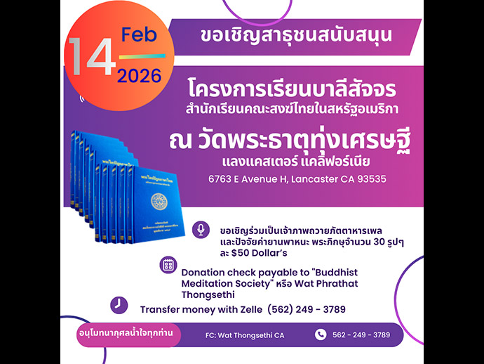 ขอจำเริญพร ธรรมะสบายๆ สไตล์วัดพระธาตุทุ่งเศรษฐี ธรรมะง่ายๆ ฟังสบายๆ แต่ได้สาระธรรม สามารถนำไปใช้ในชีวิตประจำวันได้จริง ขออนุญาตแจ้งญาติแจ้งโยมว่า วันที่ 14 กุมภาพนธ์ 2569 ทางวัดพระธาตุทุ่งเศรษฐี แลงแคสเตอร์ แคลิฟอร์เนีย เตรียมต้อนรับคณะพระสงฆ์ / ครูสอนบาลี ร่วม 30 รูป ในโครงการเรียนบาลีสัญจร สำนักเรียนคณะสงฆ์ไทยในสหรัฐอเมริกา ในวันนั้นขอความอนุเคราะห์ขอความอุปถัมภ์เรื่องภัตตาหารเพล ขอข้าวหม้อแกงหม้อพอประมาณจากน้ำใจผู้มีจิตศรัทธาทุกท่าน หรือจะถวายร่วมเป็นเจ้าภาพถวายปัจจัยทุนการศึกษา / ค่ายานพาหนะ รูปละ $50 dollar's จึงขอแจ้งไว้ ณ โอกาสนี้