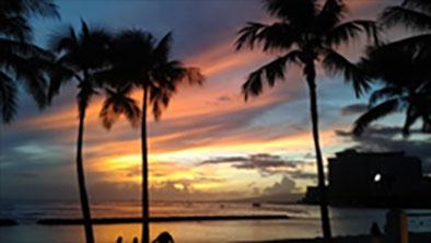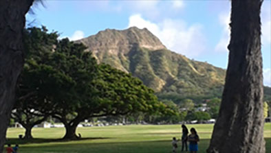 ที่ปลายไวกิกิ นอกจากต้นมะพร้าวเรียงรายใบพริ้วตาม trade winds ตะวันออกเฉียงเหนือสู่ตะวันตกเฉียงใต้สู่ทะเล ก็ยังเห็นภูเขาไฟที่สงมาหลายร้อยปี ชูยอดเขาตระหง่านเหมือนดังทักทายไวกิกิ