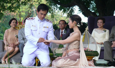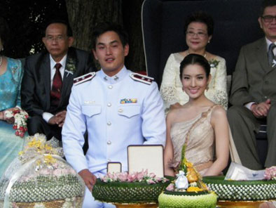 โดยมี พลเอกสุรพันธ์ พุ่มแก้ว และคุณพรชลี พุ่มแก้ว ภริยา เป็นประธานในพิธีฝ่ายเจ้าบ่าว ส่วนประธานฝ่ายเจ้าสาวคืออาจารย์วันชัย รวยอารี และคุณนภาพร รวยอารี จากนั้นเจ้าบ่าวได้สวมแหวนเพชรที่นิ้วนางด้านซ้ายให้แก่เจ้าสาว และเจ้าสาวก็นำแหวนมาสวมที่นิ้วนางด้านซ้ายแก่เจ้าบ่าว ขณะนั้นเจ้าบ่าวสุดปลื้ม จนน้ำตาคลอเต็มเบ้า จนเจ้าสาวต้องส่งกระดาษให้ซับ และมีพิธีเจ้าบ่าวมอบเงินสินสอด แต่ไม่ได้แจ้งจำนวนเงิน พร้อมไหว้คุณพ่อคุณแม่เจ้าบ่าวและเจ้าสาวและญาติผู้ใหญ่ และสังเกตเห็นเจ้าบ่าวน้ำตาคลอเบ้าตาแดงตลอดเวลา จนพิธีกรสาวซึ่งเป็นน้องสาวของเจ้าสาว แอฟ ทักษอร ประกาศแซวว่า เจ้าบ่าวปลื้มจนร้องไห้ จากนั้นเป็นพิธีทางสงฆ์ โดยได้นิมนต์พระภิกษุสงฆ์จำนวน 9 รูป มาเจริญพระพุทธมนต์และถวายภัตตาหาร โดยมีพระอาจารย์ ไพจิต เขมธัมโม เจ้าอาวาสวัดป่าฉิมกลางบรรพต ต.พญาเย็น อ.ปากช่อง เป็นประธานฝ่ายสงฆ์ ซึ่งเป็นพระที่นายไพวงษ์ บิดาเจ้าบ่าวนับถือและเคยไปบวชที่วัดแห่งนี้