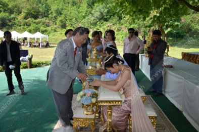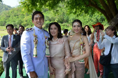 หลังจากพิธีทางสงฆ์เสร็จแล้ว พระอาจารย์ไพจิต ได้อวยพรและสั่งสอนแด่คู่บ่าวสาวว่า ให้จำวันนี้ให้ดี ถ้ามีปัญหาไม่เข้าใจกัน ก็ชวนกันมานั่งใต้ต้นมะขาม สูดอากาศที่บริสุทธ์ และทบทวนในสิ่งที่ดีเป็นผู้สวมมงคลและเจิมหน้าผาก จากนั้นก็เป็นพิธีรดน้ำสังข์ โดยมีแขกผู้ใหญ่ทั้งในวงการ และนอกวงการร่วมแสดงความยินดีเป็นจำนวนมาก เช่น ประสาร มาลีนนท์ มยุรฉัตร เหมือนประสิทธิเวช พีท ทองเจือ ชาย ชาตโยดม ควงคู่มากับแฟนสาว สุนิสา เจทท์ สุรวุฒิ เชิดชัย นายกเทศมนตรีนครนครราชสีมา พร้อมกล่าวว่า โชคดี