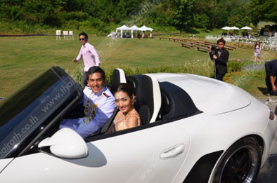 จากนั้นเจ้าบ่าวได้ควงคู่เจ้าสาวขึ้นนั่งบนรถเก๋ง Porsche สีขาว เปิดประทุน แผ่นป้ายทะเบียน สีขาว มีข้อความว่า "22 April 2012 just married" และบรรทัดที่ 3 เขียนว่า "aff&karn" ด้วยตัวอักษรสีฟ้า ขับออกจากบริเวณทำพิธี ขึ้นเนินไปหน้าเต็นท์โดม โดยมีกระป๋องผูกติดด้านหลังรถลากไปส่งเสียงดัง ขึ้นไปทานอาหารและขอบคุณแขก ที่มาร่วมแสดงความยินดีในเต็นท์โดมที่นั่งรับประทานอาหาร จากนั้นกลับมาทำพิธีจดทะเบียนสมรส โดยนายวิบูลย์ รัตนาภรณ์วงศ์ นายอำเภอปากช่อง เป็นนายทะเบียน จดทะเบียนสมรสใต้ต้นมะขามคู่