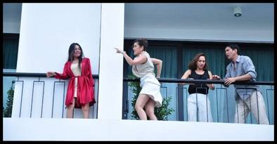 ฉากนี้เป็นตอนที่นพนภา (ธัญญ่า) และเนตรนภิศ (เจนสุดา ปานโต) น้องสาว จับได้ว่าเจนภพ (ปิ๊บ) สามีจอมเจ้าชู้แอบซุกเมียน้อยไว้ในโรงแรม แม้เจนภพจะตีหน้าซื่อขนาดไหน แต่เนตรนภิศก็ขุดหาหลักฐานเป็นชุดชั้นในเจอจนได้ และเมื่อเจอว่าเมียน้อยยืนหลบอยู่ริมระเบียงห้อง นพนภาปรี๊ดแตกของขึ้น รีบปีนระเบียงตามไปจัดการขั้นเด็ดขาด!!