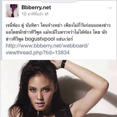 อนึ่ง หลังจากมีการแชร์ข้อความดังกล่าวออกไปอย่างแพร่หลาย bogustvpool ก็ได้ออกมาชี้แจงว่า ข้อความที่ตนระบุนั้นก๊อปมา จากในกลุ่มของนักข่าว ซึ่งตัวเขาเองไม่ได้กล่าวหาว่า เจนี่ ท้อง แต่อย่างใด พร้อมยืนยันว่า เจนี่ ไม่ได้ท้อง เพราะมีเอกสารมายืนยันอีกต่างหาก...