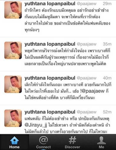กับข่าวที่ออกมาทั้งจากการกระทำของผู้ใหญ่เอง ทั้งปฏิกิริยาเหล่าแฟนคลับของหนุ่มเจมส์ต่างๆ นานา เหล่านี้นี่เองที่ทำเอาผู้ใหญ่ในวงการ และมีส่วนปั้นหนุ่มเจมส์ให้โด่งดังขึ้นมาจากบทของ “ท่านชายพุฒิภัทร” อย่าง “ป้าแจ๋ว” ยุทธนา ลอพันธุ์ไพบูลย์ ต้องออกมาแสดงความคิดเห็นผ่านเฟซบุ๊กด้วยความห่วงใย โดยเตือนสติไปยังเหล่าแฟนคลับทั้งหลายว่าหากจะรักใครก็ควรจะรักอย่างมีเหตุผล เพราะไม่เช่นนั้นการกระทำดังกล่าวก็อาจจะย้อนกลับไปทำร้ายทำลายคนที่เรารักอย่างไม่รู้ตัวก็ได้