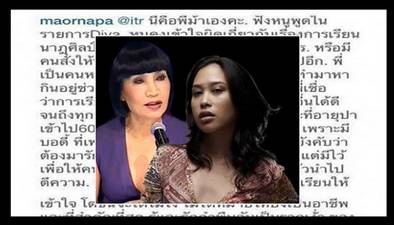 "@itr นี่คือพี่ม้าเองค่ะ ฟังหนูพูดในรายการ Diva. หนูคงเข้าใจผิดเกี่ยวกับเรื่องการเรียนนาฏศิลป์ จึงพูดออกมาอย่างไม่รู้เท่าถึงการ หรือมีคนสั่งให้พูดเพื่อให้เรื่องมันยืดเยื้อออกไปอีก พี่เป็นคนหนึ่งที่จบนาฏศิลป์ชั้นสูงมา เคยใช้ทำมาหากินอยู่ช่วงหนึ่งของชีวิต แล้วก็เลิกลาไป พี่เชื่อว่าการเรียนของพี่มันต่อยอดให้พี่ ทำเรื่องอื่นได้ดีจนถึงทุกวันนี้ ที่หนูเห็นอยู่นั่นแหละ ในขณะที่อายุปาเข้าไป 60 แล้ว ฝรั่งก็ได้ เทรนด์ไหนมาก็ได้ เพราะมีบอดี้ ที่เฟรกซิเบลล์ การเรียนไม่ได้หมายบังคับว่าต้องมารักรำ และมีอาชีพรำ หรือแค่เป็นครู แต่มีไว้เพื่อให้คนรุ่นหลังไม่โง่ เข้าใจอะไรผิดๆแล้วนำไปตีความ นาฏศิลป์รวมทั้งของไทยและฝรั่ง เรียนให้เข้าใจ โตขึ้นจะได้ไม่โง่ ไม่ได้หมายถึงให้ยึดเป็นอาชีพ และที่สำคัญที่สุด รู้และรักกำพืดอันเป็นรากเหง้าของเราในความเป็นไทย สมัยนี้ไม่ชอบของไทย ชอบของนอก แต่ก็ไม่นอกเท่ากับพี่ แค่เปลือกๆกันทั้งนั้น ทั้งพูดทั้งแสดงออก แต่พี่มีความสำเหนียกของความเป็นไทยเสมอ อยู่ในสายเลือดเลยล่ะ ไม่พอใจกันทำไมไม่ไปอยู่ประเทศอื่น หน้าด้านอยู่ในประเทศไทยที่มีรากเหง้าของตัวเองทำไม ก็เพราะไม่กล้าไง เห็นไหม เปลือกชัดๆ เขียนมายาวคงเข้าใจขึ้นนะคะ แล้วไปบอก เบียร์และแขก ด้วย ซึ่งพี่เสียใจมากเพราะรู้จักดีมากๆ ทั้ง 2 คน มีโอกาสจะจับเข่าพูดให้ใจ จาก คนไทยแท้ๆ ที่รักความเป็นไทย"
