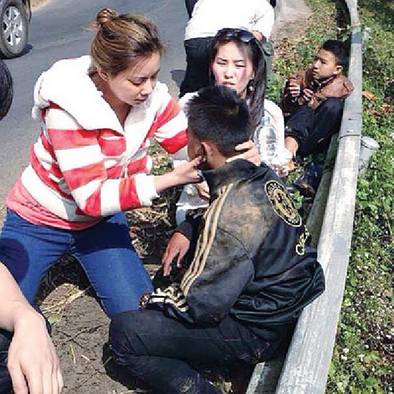 และ เล่าต่อว่า "ระหว่างวันว่าง เลยไปเที่ยวดอยแม่สะลอง ขากลับเจอเด็กชาวเขาสองคนประสบอุบัติเหตุ ทะลุโค้งออกไปพาดราวเหล็ก ก็ไปช่วยเขาขึ้นมา เช็กอาการ เบื้องต้นกระดูกไม่หัก ก็ส่งน้องๆ ต่อ ยอมรับเจอเหตุการณ์แบบนี้เยอะ อาจเพราะเราวิ่งงานเลยเจออุบัติเหตุบ่อย ถ้าเป็นรถยนต์ส่วนตัวบุ๋มจะมีกระเป๋าปฐมพยาบาล เพราะเราอยู่หน่วยกู้ภัยมังกร คนจะไม่รู้ ไม่ค่อยออกหน้า ส่วนวันที่เจอน้องชาวเขาเราเช่ารถตู้ไปเลยไม่มีอุปกรณ์ แต่ถ้ามีโอกาสก็จะช่วยเหลือทุกครั้ง ไม่รีรอที่จะไม่ช่วย"