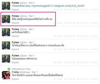 นอกจากนี้ ยังมีชาวโซเชียลเน็ตเวิร์กได้มีการแค็บชันภาพที่ระบุว่าเป็นการโพสต์ข้อความผ่านทางทวิตเตอร์ของน้องฝ้ายที่มีการใช้คำค่อนข้างหยาบคายไม่เหมาะสม มาเผยแผ่ในสังคมออนไลน์ พร้อมกับเปรียบเทียบไปยังกรณีของหนึ่งในผู้เข้าประกวด “ต๊อบ ฟองพิกุล ทองลิ้ม” ซึ่งต้องออกจากการประกวดนี้ไป เหตุเพราะมีการโพสต์คำหยาบที่คล้ายกรณีนี้
