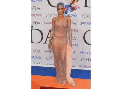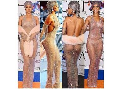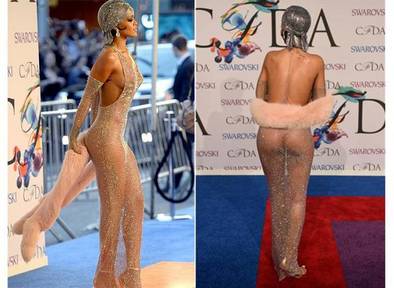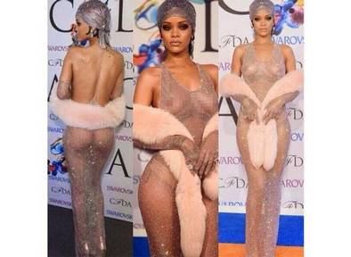 นครนิวยอร์ก สหรัฐอเมริกา เมื่อวันที่ 2 มิ.ย. นักร้องสาวชื่อดัง “ริฮันนา” วัย 26 ปี สร้างเสียงฮือฮาในงาน “เคาท์ซิล ออฟ แฟชั่น ดีไซเนอร์ส ออฟ อเมริกา”หรือ “ซีเอฟดีเอ” จัดขึ้นที่นครนิวยอร์กของสหรัฐ ซึ่งถือเป็นงานประกาศรางวัลด้านแฟชั่นชื่อดังของสหรัฐ เปรียบได้กับงานประกาศรางวัล “ออสการ์” ของวงการแฟชั่น ทั้งนี้ ริฮันนาปรากฏตัวในชุดโปร่งใสประดับคริสตัลทั่วตัวยาวถึงพื้น ที่เผยให้เห็นรูปร่างแบบไม่มีการปกปิด โดยชุดประกอบไปด้วยถุงมือใสยาวเลยศอก ผ้าโพกศีรษะ และชุดยังได้เผยให้เห็นแผ่นหลังของเธอ นอกจากนี้ เธอก็ใส่เพียงกางเกงชั้นในเพื่อปกปิดของสงวนไว้เท่านั้น