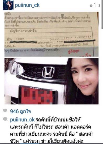 “รถคันนี้ที่บ้านนุ่นซื้อให้ และรถคันนี้ก็ไม่ใช่รถฮอนด้า แอคคอร์ด ตามที่ข่าวเขียนนะคะ รถคันนี้คือ ฮอนด้า ซีวิค แค่รุ่นรถ ข่าวก็เขียนผิดแล้วค่ะ เห็นแค่รูปจากไอจีก็ไปเขียนต่อยอดต่างๆ นานา และรถคันนี้ที่เป็นทะเบียนสมุทรปราการ เพราะบ้านนุ่นอยู่ในเขตสมุทรปราการ นุ่นมีหลักฐานยืนยันความจริงหมดว่าเป็นของนุ่นเอง ไม่ได้มีคนซื้อให้ ขอความกรุณาเห็นใจนุ่นเถอะนะคะ ข่าวที่ออกไปมันคือข้อคิดเห็นของสื่อ มันไม่ใช่ข้อเท็จจริงเลย ซึ่งตอนนี้มันมีผลกระทบต่อจิตใจของครอบครัวของนุ่นเป็นอย่างมาก ขอความเห็นใจอย่างที่สุดเถอะนะคะ”